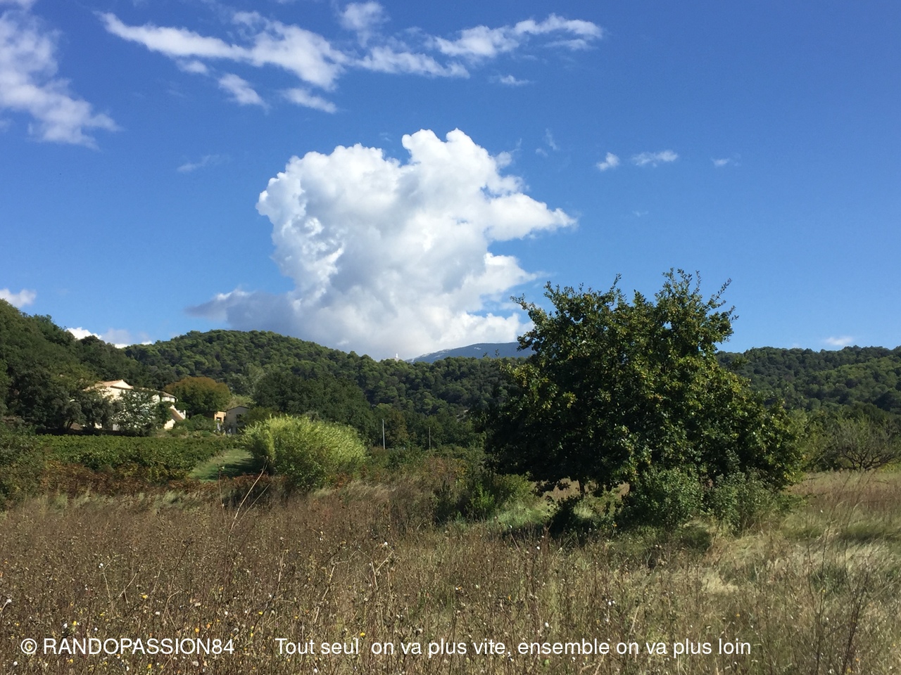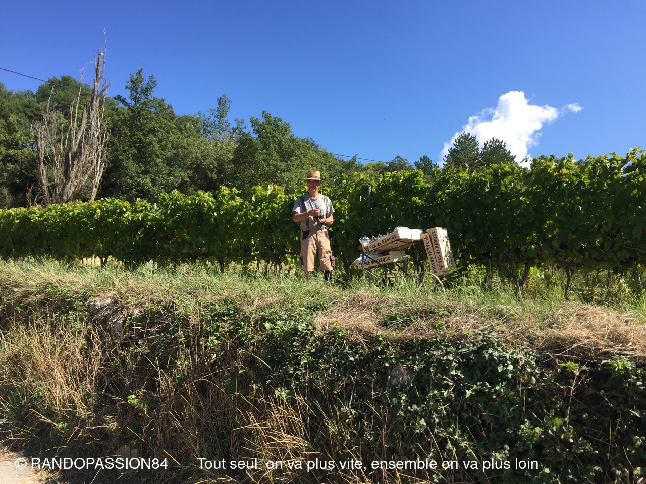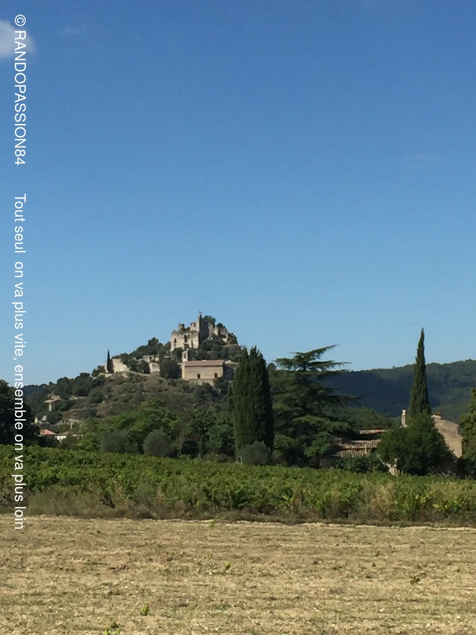 Nous avons profité du soleil tout en cheminant vers les chapelles ND de Nazareth et St André. Chemin faisant nous apercevons des têtes de vendangeurs dépassant des rangs de vigne … c’est la saison des vendanges.