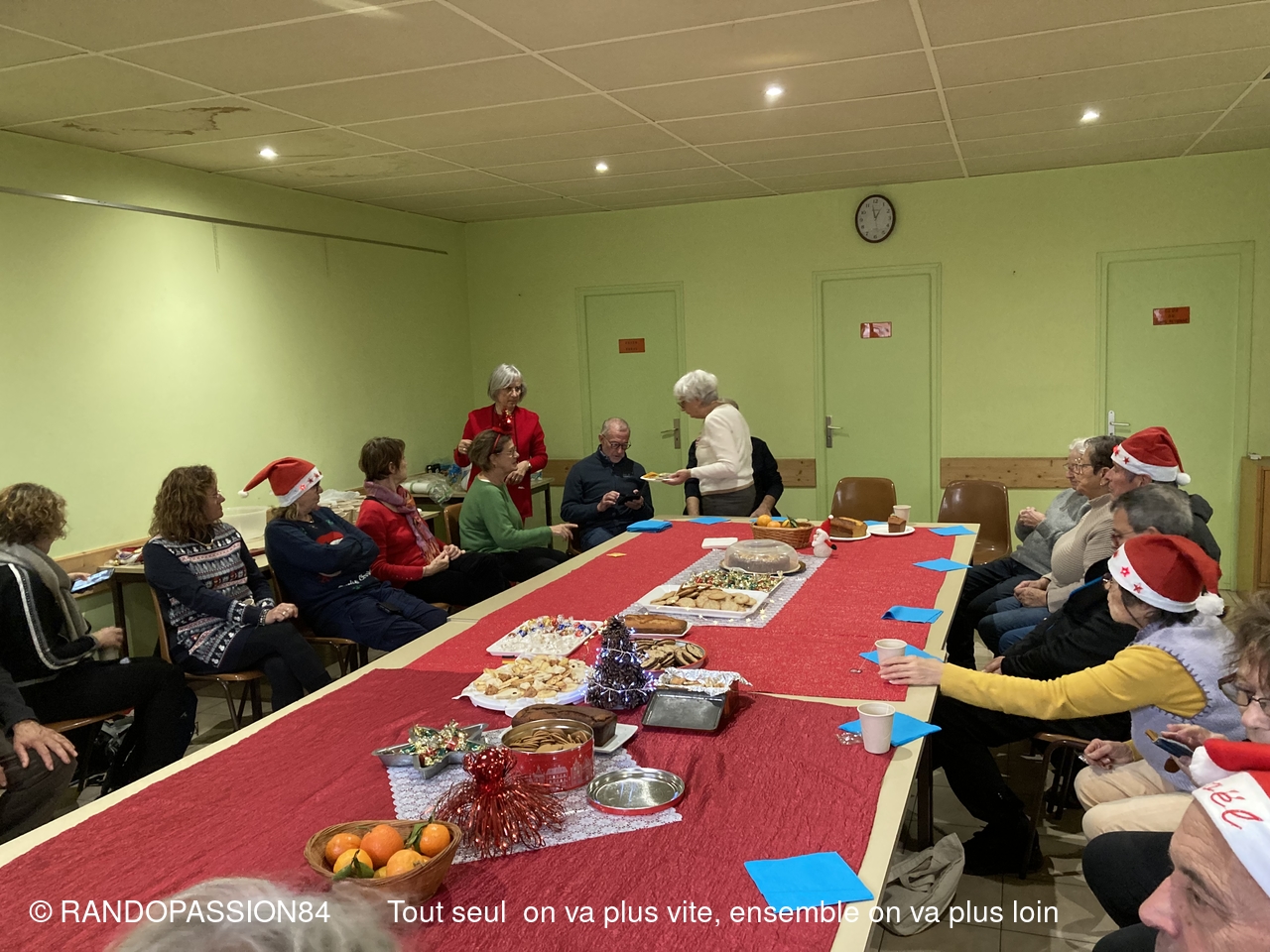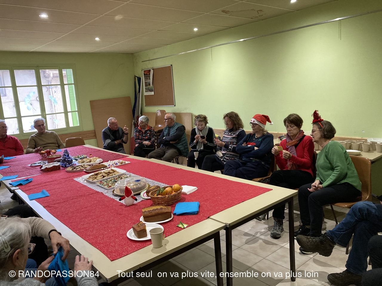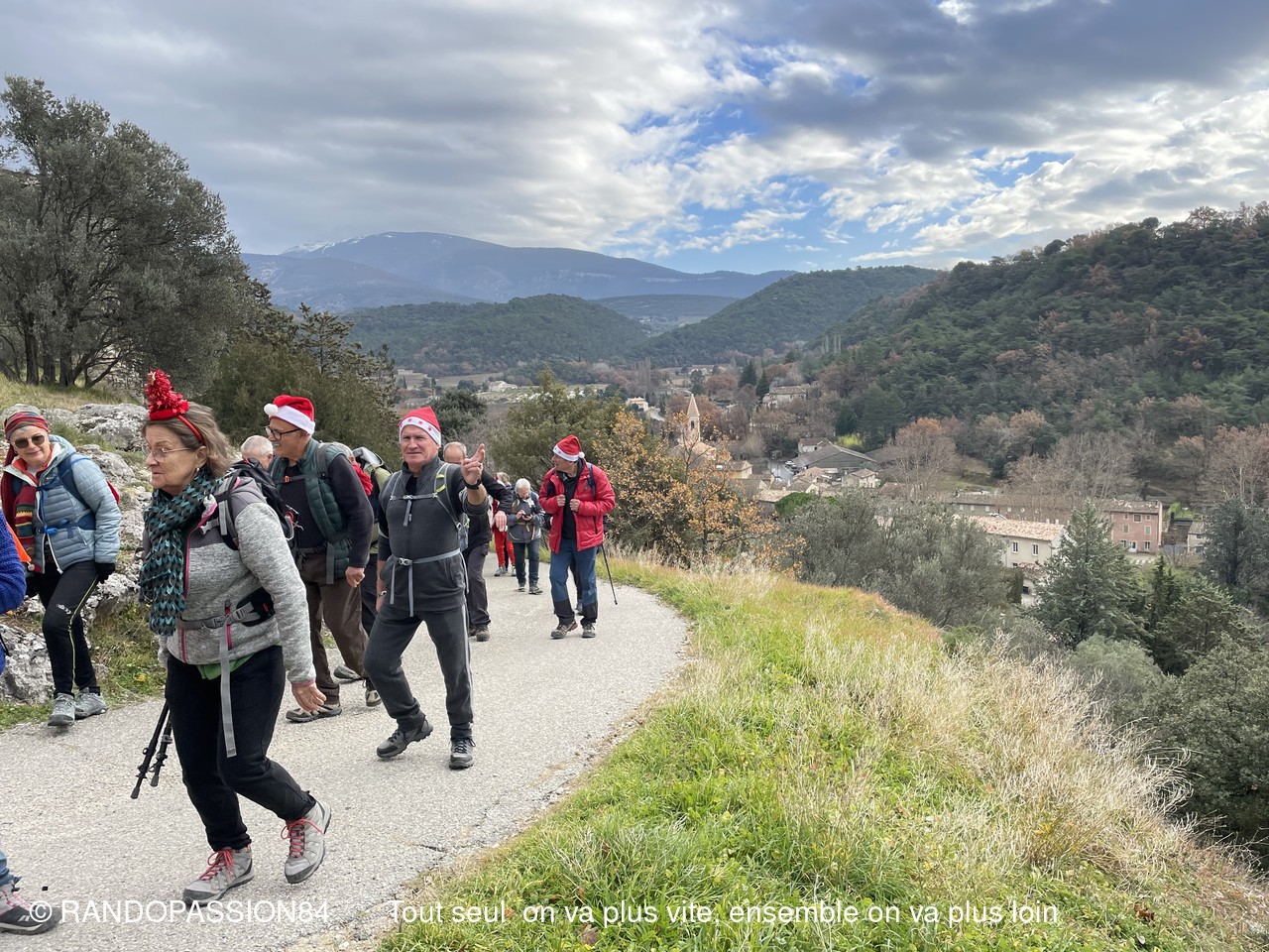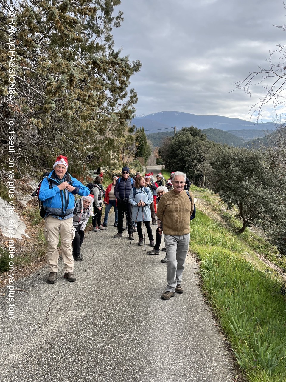 Pour cette dernière randonnée de l'année 2024 les adhérents ont joué le jeu : entre les bonnets, les pulls de Noël, les vêtements rouges et même les guirlandes lumineuses, notre groupe de Gais Lurons n'est pas passé inaperçu sur les chemins d'Entrechaux. D'ailleurs notre passage devant l'école a déclenché quelques hurlements de joie.