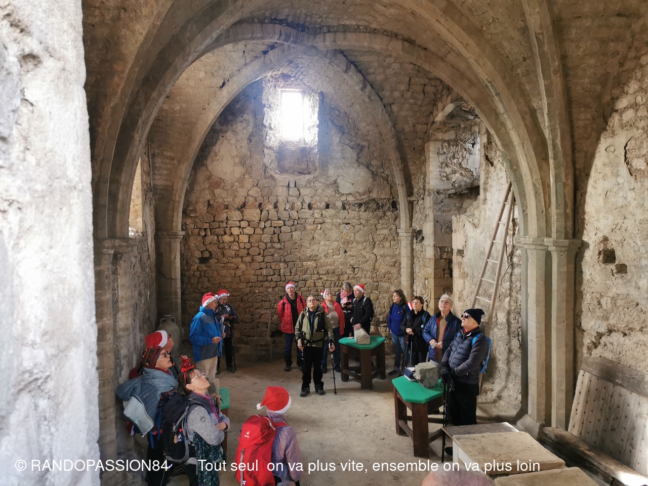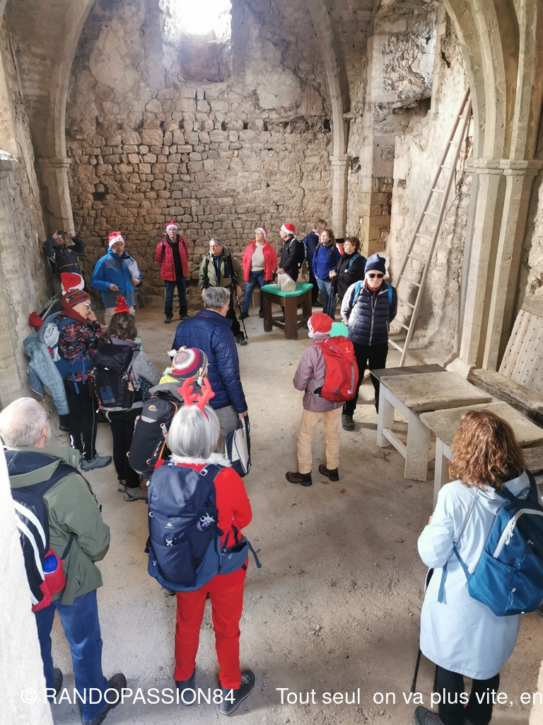 " Merci à Daniel d'avoir, pour la dernière sortie de l'année, emmenés les 24 randonneurs que nous étions sur le chemin des écoliers qui, traversant l'emplacement de l'ancien village grimpe presque jusqu'au château. Merci à Gilbert de nous avoir ouvert les portes pour accéder à la chapelle Saint Quenin. Ensuite c'est la chapelle ND de Nazareth, puis celle de St André qui nous ont livré ( presque) tous leurs secrets. Les nuages chargés de pluie ont daigné nous épargner. Au retour un délicieux goûter de Noël nous attendait. Merci aux généreuses organisatrices! " ( Sic Fabienne)
