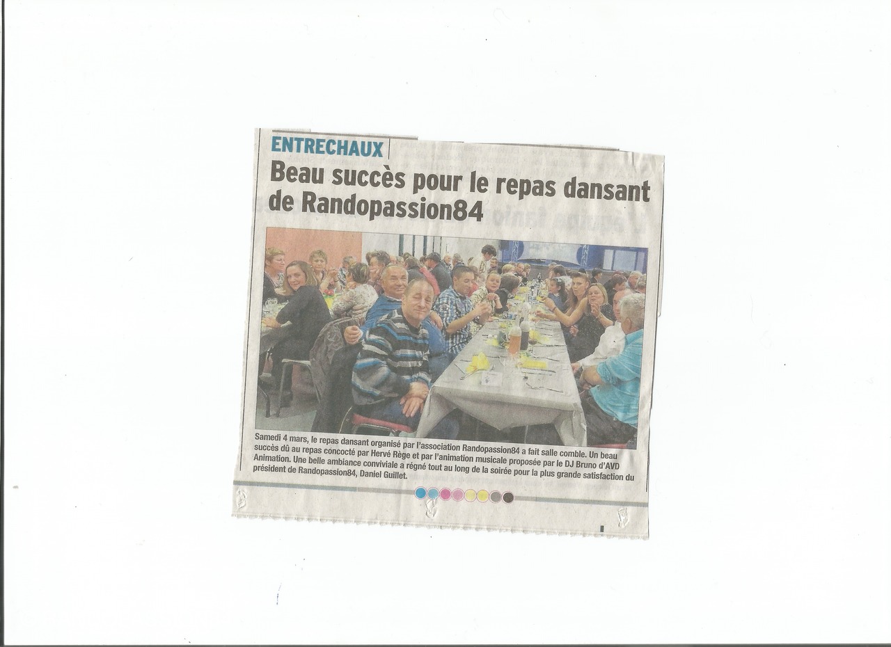 Pas d'autosatisfaction !......mais notre repas dansant à été réussi.....beaucoup de monde à l'apéritif, repas, et sur la piste de danse ou le DJ Bruno a assuré ! Merci à tous les participants, à l'organisateur, notre Président Daniel qui a orchestré tout ce petit monde d'adhérents bénévoles qui s'est investit....chaque année est une nouvelle expérience, le Président en tire les conclusions...pour vous offrir le meilleur, à un prix compétitif...Le Président, les Membres du Bureau, remercient également la Municipalité d'Entrechaux, Monsieur le Maire, qui mettent à dispositon gratuitement la Salle des Fêtes............ Cécile.