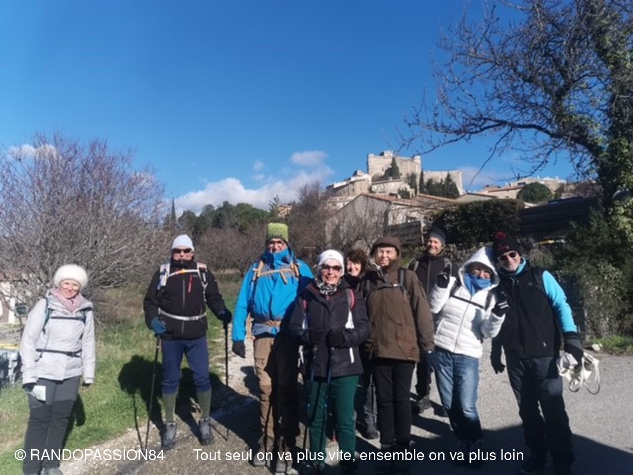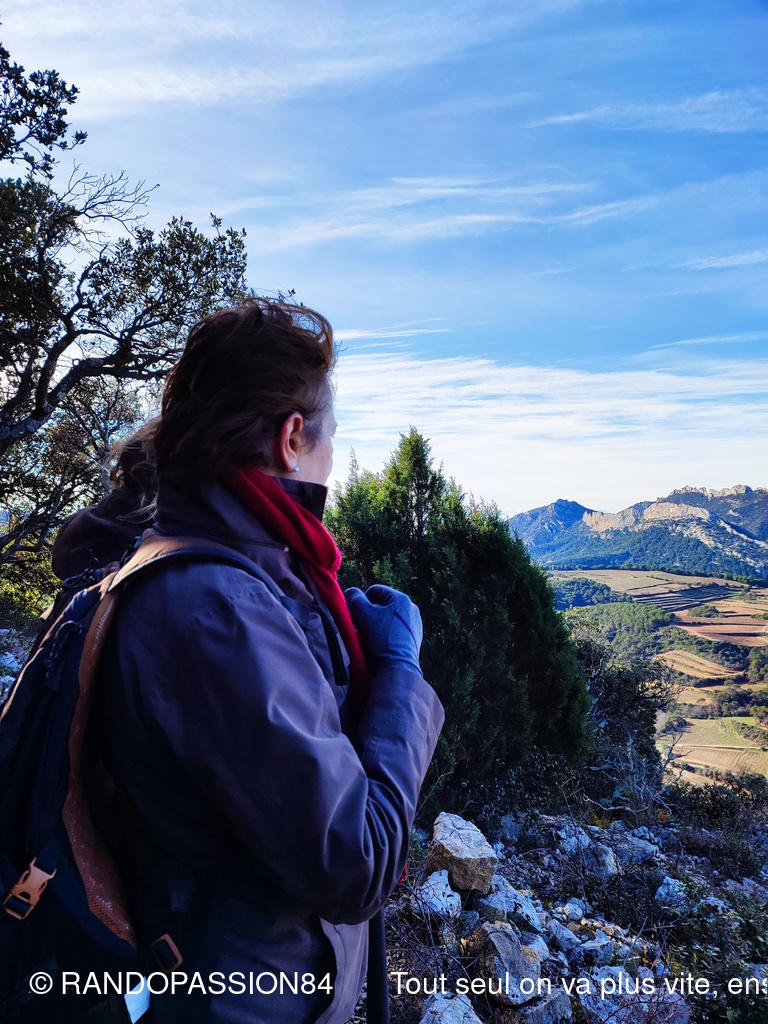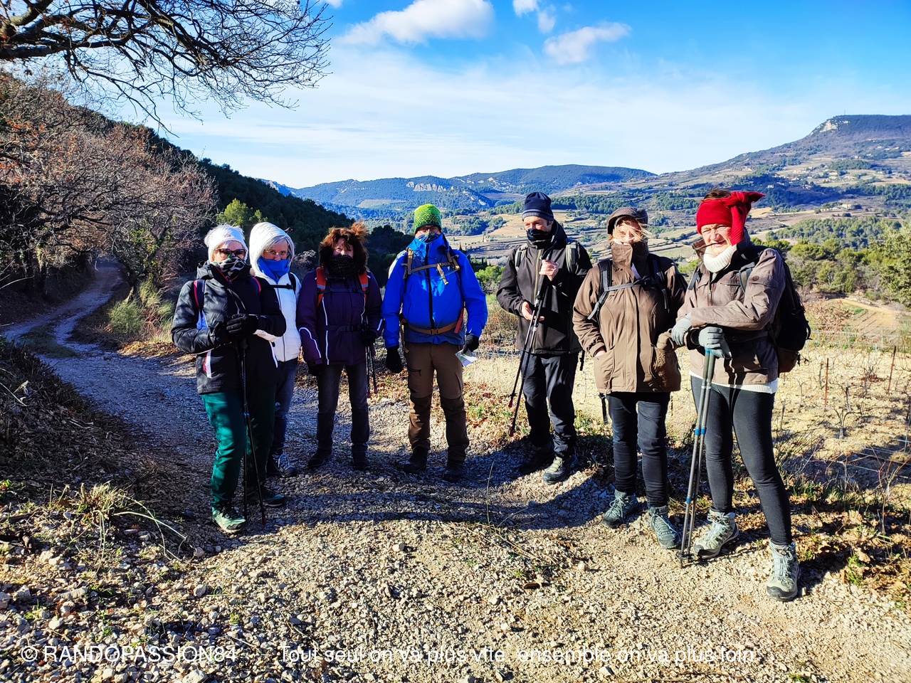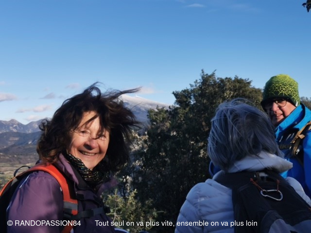 Le soleil était au rendez-vous pour cette randonnée autour du Barroux mais également le mistral et il nous a fallu un bel équipement de bonnets écharpes, gants, bandeaux ..... comme en témoigne les photos, pour affronter ce vent glacial. Mais bien équipés quel plaisir de découvrir où de redécouvrir ces paysages . D'un côté ou de l'autre de la vallée ce fut l'émerveillement  avec à l'horizon les lointains sommets enneigés qui nous rappellent que nous sommes au coeur de l'hiver.