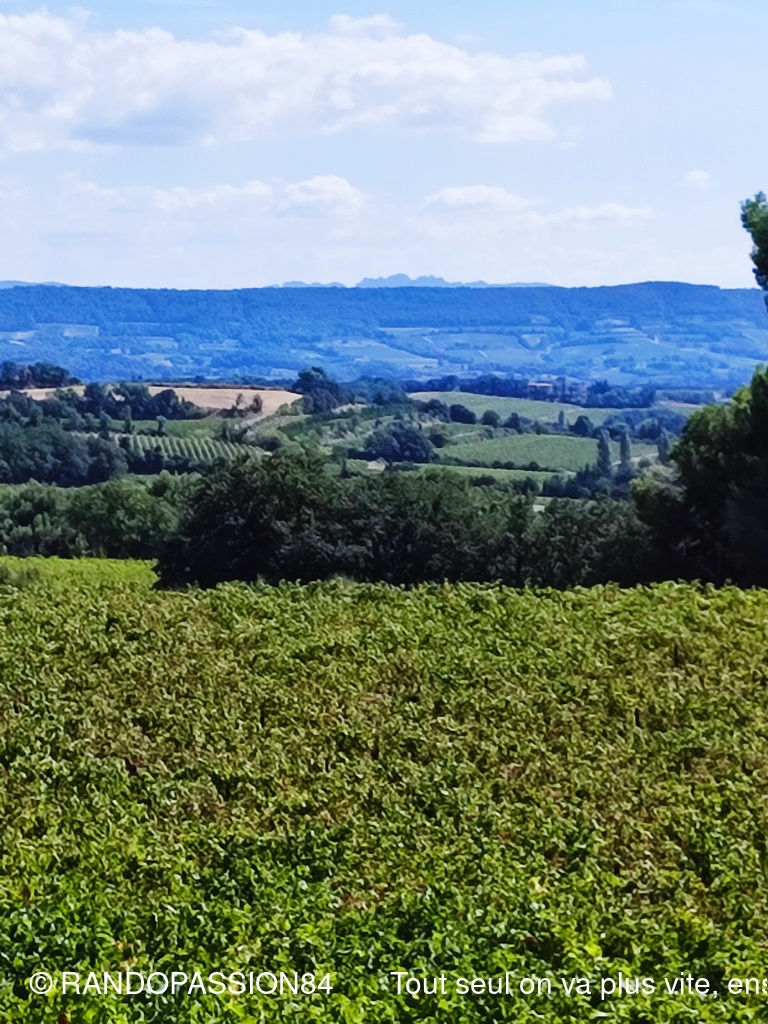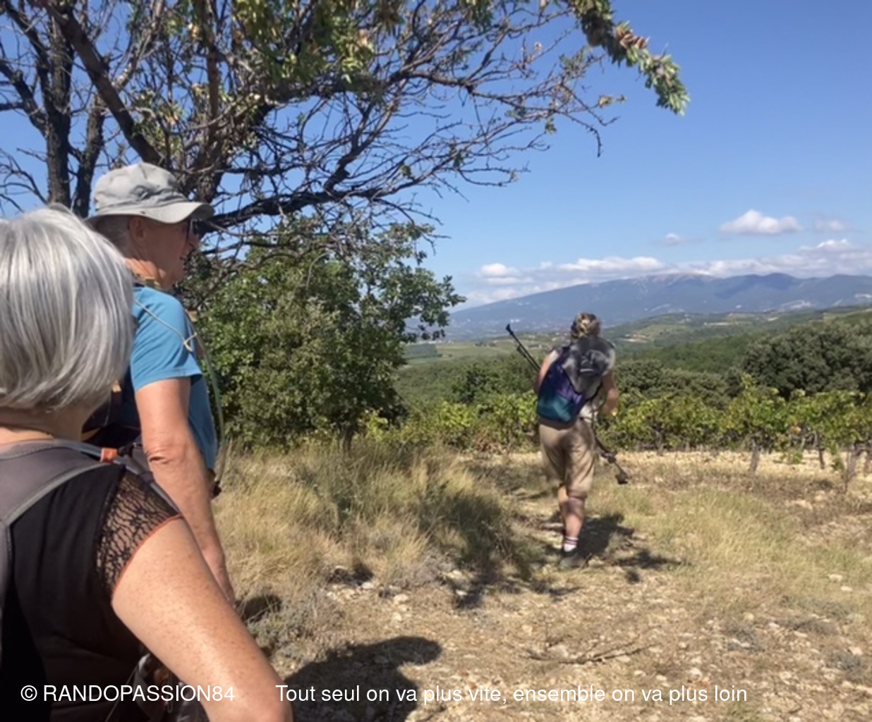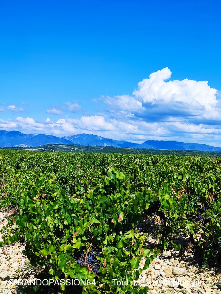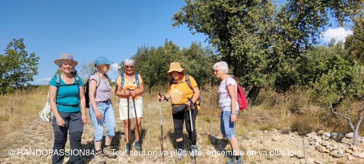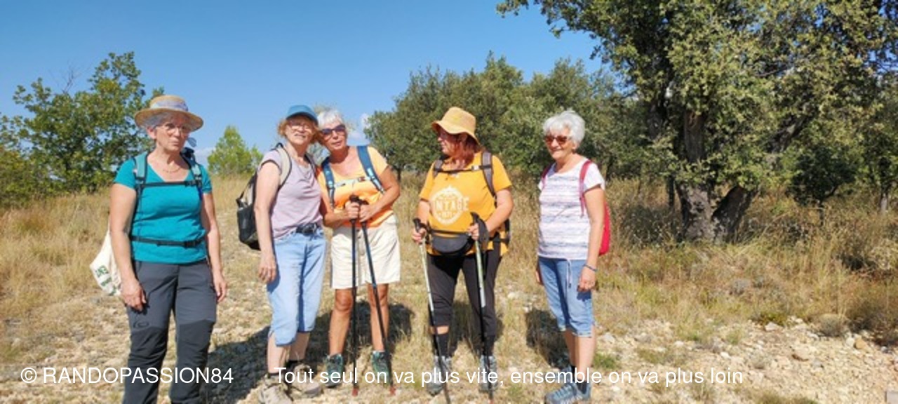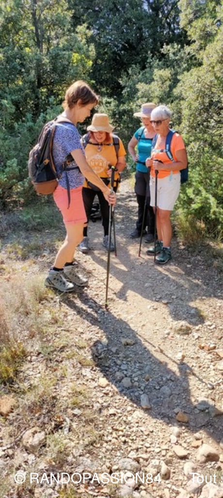 Le G1 regroupait 6 randonneuses, par un temps plus agréable (il a fait "seulement" chaud) que le jour de la reco !! Une longue crête au-dessus de Visan, qu'on ne soupçonne pas forcément quand on contourne le village en voiture, nous a permis de profiter d'une vue dominant Visan, allant côté nord de Valréas à Grignan jusqu'aux éoliennes qui remontent la vallée du Rhône, la montagne de la Lance et côté sud notre indéfectible Ventoux (la tête dans les nuages), les Dentelles, la montagne de Bluye. Quelques facteurs de ralentissement (une soit-disant propriété privée, une pente caillouteuse) ont fait que le G2 a failli arriver aux voitures avant le G1 (c'eût été une première !!), mais finalement non.(Sic Fabienne)