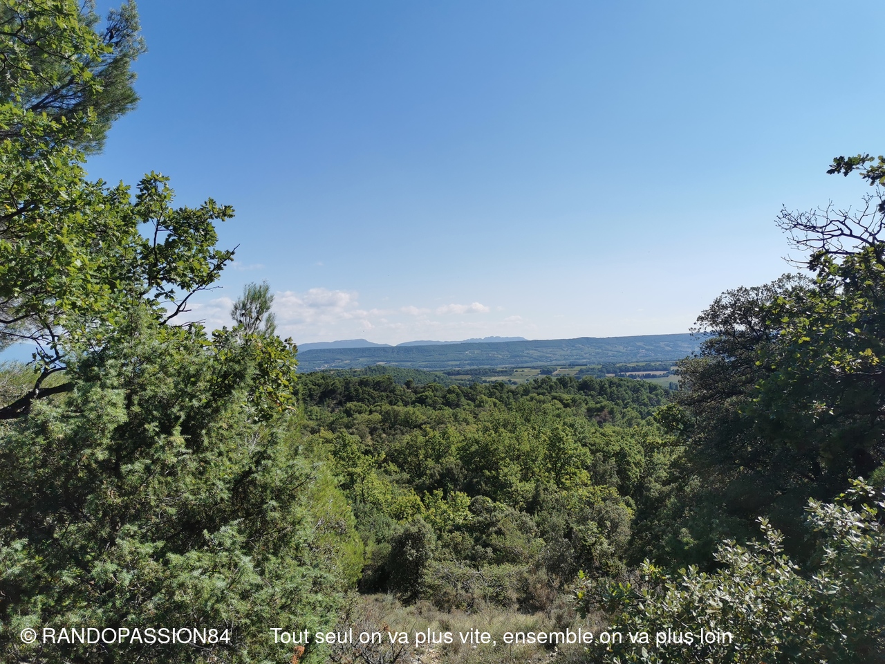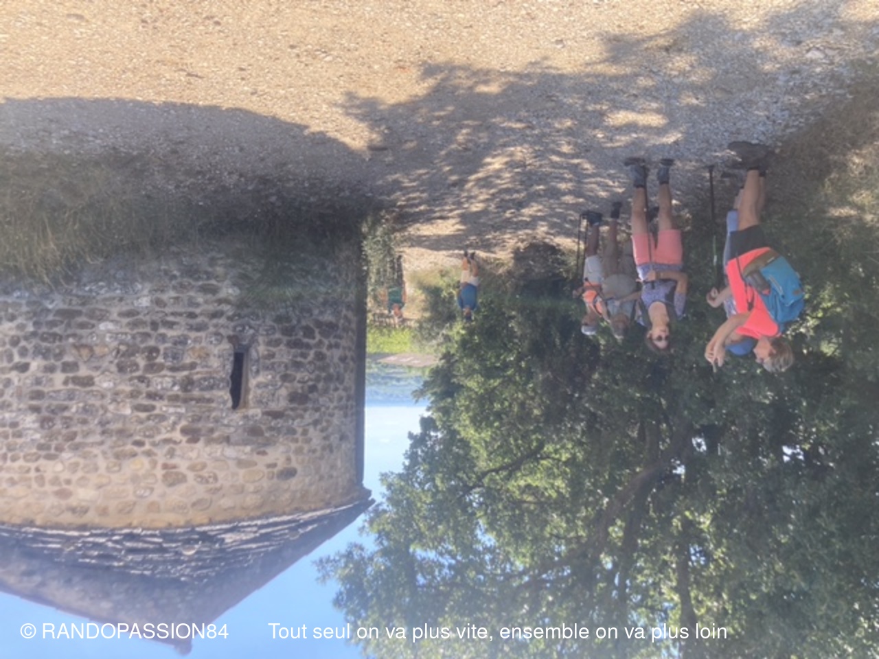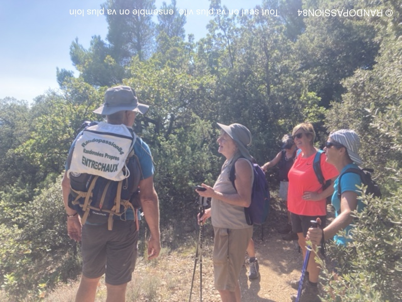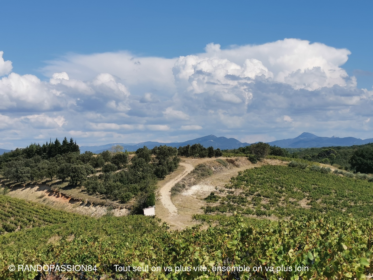 Le G1 regroupait 6 randonneuses, par un temps plus agréable (il a fait "seulement" chaud) que le jour de la reco !! Une longue crête au-dessus de Visan, qu'on ne soupçonne pas forcément quand on contourne le village en voiture, nous a permis de profiter d'une vue dominant Visan, allant côté nord de Valréas à Grignan jusqu'aux éoliennes qui remontent la vallée du Rhône, la montagne de la Lance et côté sud notre indéfectible Ventoux (la tête dans les nuages), les Dentelles, la montagne de Bluye. Quelques facteurs de ralentissement (une soit-disant propriété privée, une pente caillouteuse) ont fait que le G2 a failli arriver aux voitures avant le G1 (c'eût été une première !!), mais finalement non.(Sic Fabienne)