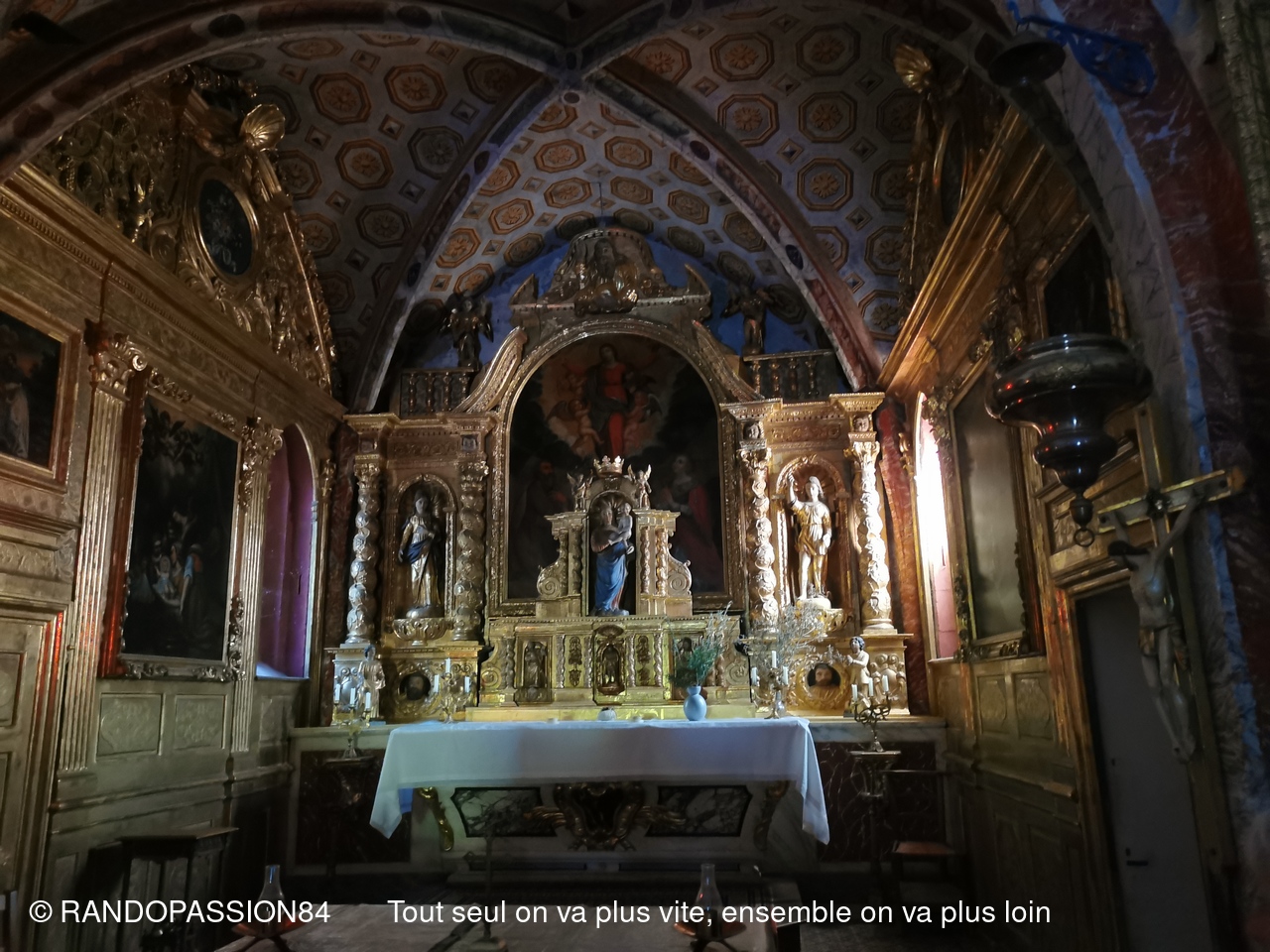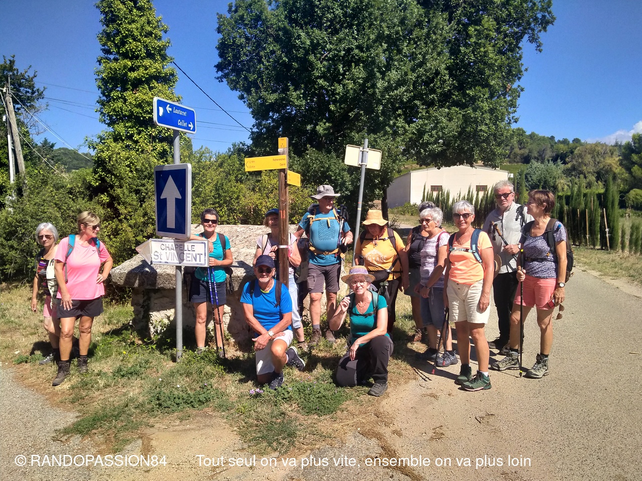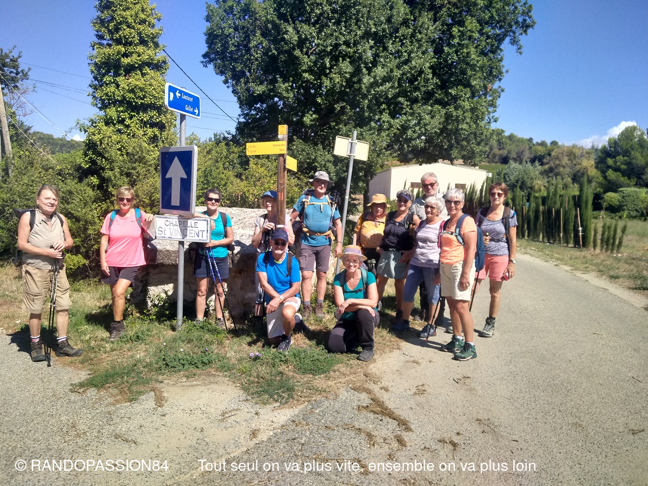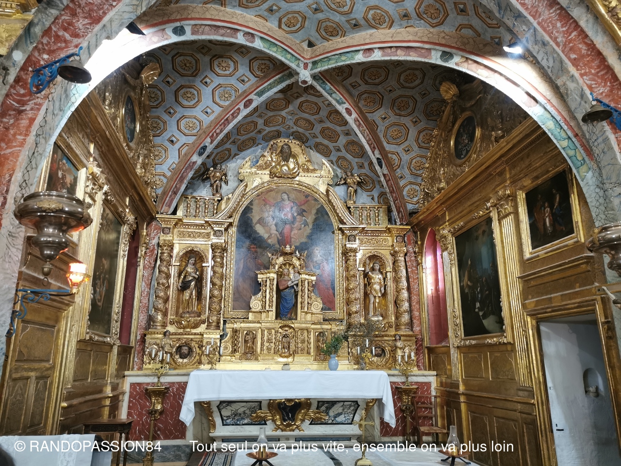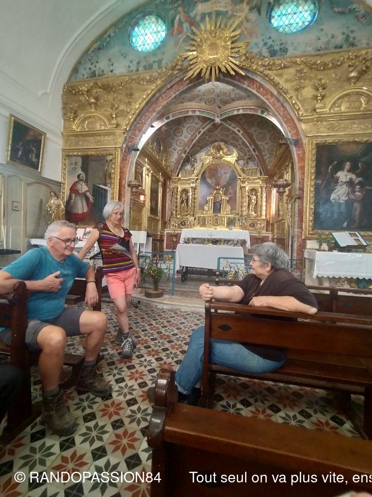 Durée environ 3 heures. Boucle sans difficultés (8 km) autour du village de Visan et entre ses vignes. 3 randonneurs et 5 randonneuses y ont assisté. Beau temps avec de beaux nuages, de belles vues panoramiques. Deux chapelles au bord du chemin : La chapelle St Vincent (datant 13ème siècle) et, à la fin de la marche, La chapelle ND des Vignes (16ème) avec son beau retable doré très bien conservé. Là, à l'ombre, nous avons eu le plaisir de prendre le goûter. Nous avons également eu la chance d'avoir un entretien très intéressant avec la Soeur qui renseigne les touristes sur le site. (Sic Sabine).