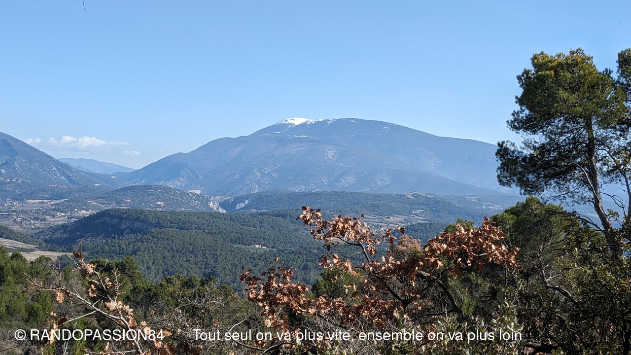 A l'arrivée sur la crête nous sommes récompensés de nos efforts par un belle vue sur le Mont Ventoux qui affichent ses pistes de skis enneigées.
